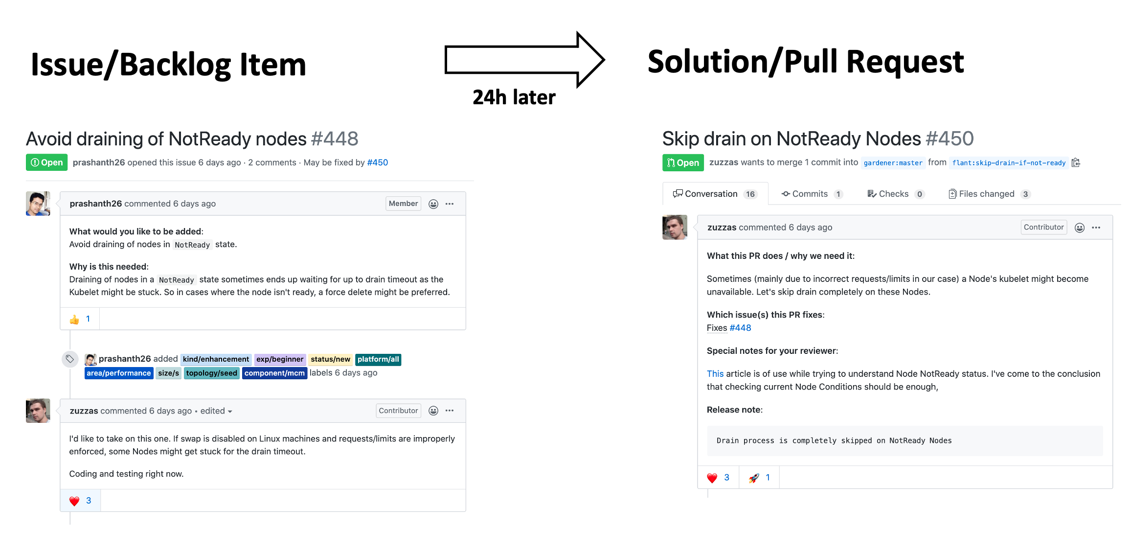 Coincidently, that was also when the SAP Open Source Program Office (OSPO) was launched. It supported us making a case to develop Gardener completely as open source. Today, we can witness that this strategy has unfolded. It opened the gates not only for adoption, but for co-innovation, investment security, and user feedback directly in code. Below you can see an example of how the Gardener project benefits from this external community power as contributions are submitted right away.