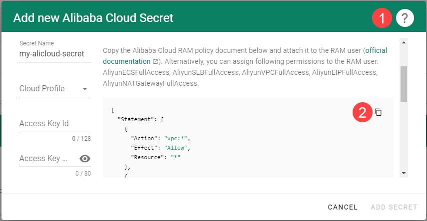 To copy the policy for Alibaba Cloud from the Gardener dashboard, click on the help icon