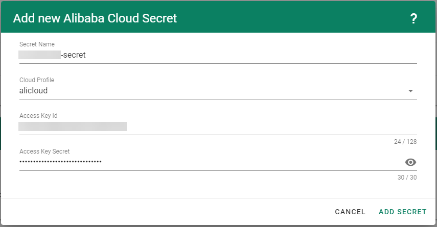 Access Key IDandSecret Access Keyyou saved when you created the technical user on Alibaba Cloud. - Choose Add secret.